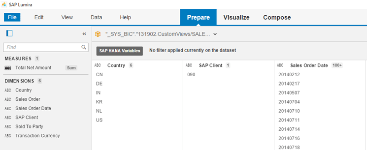 10. Once SAP Lumira has finished acquiring the data from the SAP HANA view, the data is now available in the Prepare tab (
