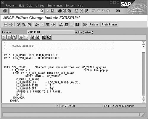 Use transaction code CMOD. Display the BW project by selecting from the drop-down menu and clicking the button. Click on the button, and then double-click on . A screen appears at the bottom with the line . Double-click on to get to the details of the include code. You or your Basis team can add the code shown in to perform the task of taking the year from the calendar month/year that the user enters. Save and activate each level of the enhancement while backing out of the screens until you reach the initial screen where you perform the final activation. Again, this is an area where you should work with an experienced ABAPer.