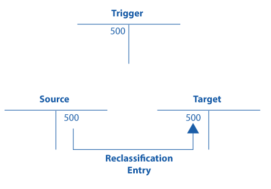Figure 1 diagrams a very simple reclassification using T-accounts in which the trigger account is assigned a debit of 500. This assignment triggers a credit to the source account and a debit to the target account. The trigger account is the account that initiates or triggers the reclassification. Without a value in the trigger account, no reclassification occurs. The source account is the account that is decreased by the amount of the trigger account. The target is the account that is increased by the amount of the trigger account. The trigger, source, and target are all defined in the customizing of the reclassification.