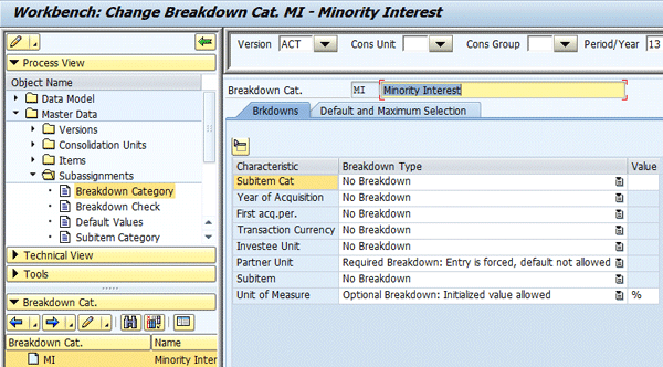 Because statistical balance accounts are used to maintain the balance of minority shares for the purchase method and for the equity share for the equity method, the breakdown category for these accounts must include a unit of measure to store the values as a percentage. These percentages are used in the definition of the reclassification to determine the percentage of minority interest to automatically post.