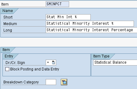 For the reclassification in SEM-BCS only, you need to create a statistical balance account to record the balance for percent of the minority share. In Figure 3, the statistical account for the percentage of minority interest is defined. To create this account, use transaction code UCWB or follow menu path Strategic Enterprise Management > Business Consolidation > Consolidation Workbench > Process View > Master Data > Items > Item. This account must be assigned a breakdown category to include a unit of measure to allow for quantities. You also need to have an additional statistical flow account for posting the offset. A statistical flow account is a statistical account for which the balance is not carried forward from year to year, where the balance of a statistical balance account is automatically carried forward from year to year. The offset account is needed because the entry to record a minority interest balance must be a balanced entry, which is a system requirement.
