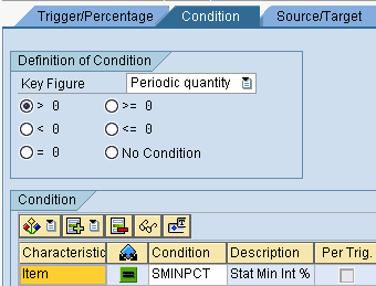 For the type of percentage rate data, choose transaction data, with key figure = quantity, and cumulative. Add trigger characteristic = the statistical balance item to record balance for percent of minority share. The second tab of the method is for the Condition. Click this tab and define the condition key figure of quantity as > 0 and add characteristic = statistical balance item to record the balance for the percent of the minority share (Figure 5).