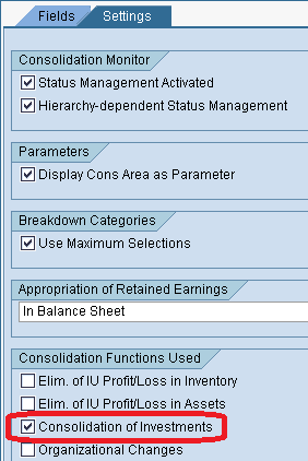 To complete the activation of COI use transaction code UCWB and follow menu path Process View > Data Model > Consolidation Area > choose the Setting tab. In the consolidation area settings, select Consolidation of Investments in the Consolidation Functions Used section (Figure 8).