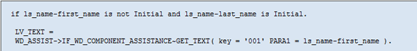 An assistance class is required to supply text information to the message. This text can also have placeholders that can be replaced by a value at run time. A custom assistance class is a child class, meaning it is inherited from the standard class CL_WD_COMPONENT_ASSISTANCE, and has implemented the standard interface IF_WD_COMPONENT_ASSISTANCE. The Get_text() method returns text by passing a text symbol. WD_ASSIT is the controller’s attribute holding a reference to the assistance object.