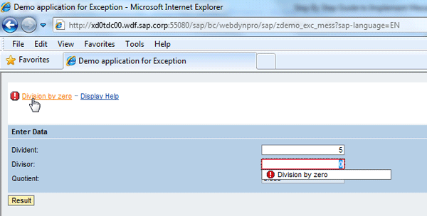 The demo application in this example accepts dividend and divisor values from the user. If the divisor is not zero, it calculates a quotient; otherwise it triggers a message that the divisor is zero (Figure 21).