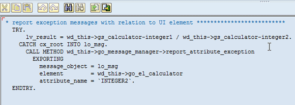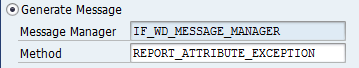 Step 2. Use the code wizard to call method report_attribute_exception (Figure 24). Pass attribute name INTEGER2 to highlight the UI element (Figure 25). lo_msg is the exception class object reference.