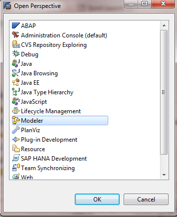 First, open HANA Studio and navigate to the Modeler section. Then follow menu path Windows > Open Perspective > Other. In the screen that opens (Figure 1) select Modeler and click the OK button. This opens the HANA Studio Modeler perspective where you create a database table in the modeler perspective.