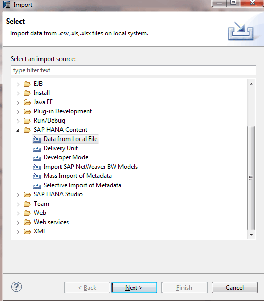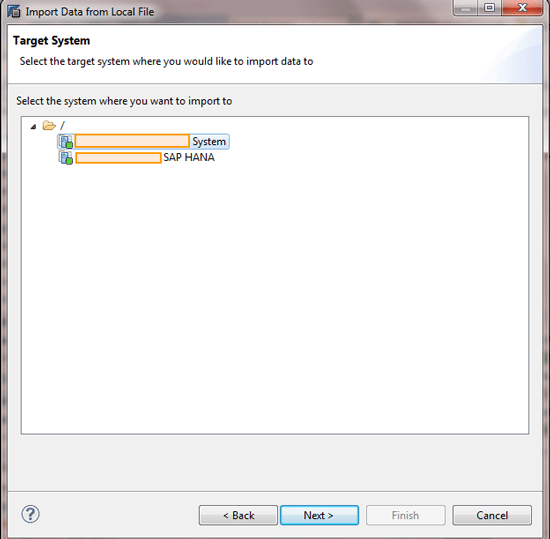 Next you want to create a database table to store customer names and addresses. You can either create a database table or you can upload a Microsoft Excel file. If you upload an Excel file the system automatically creates the database table and also populates it with data. In this example I am uploading an Excel file. To upload data from Excel, follow menu path File > Import SAP HANA Content > Data from Local File (Figure 2), and click the Next button. This opens the screen in Figure 3 where you select the target system (HANA) where you want to import the file. After you select the file, click the Next button and the screen in Figure 4 opens.