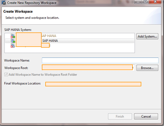Next you want to create a new repository work space. HANA is the source code repository but a representation is needed on the local machine for every HANA system. This is where the user checks out and stores their local files. In this step, create a workspace on the local machine and connect it to the HANA system. That way you can browse the content of that particular system. To create a HANA repository workspace, go to the SAP HANA Repositories tab and click the Create Workspace option, which opens the screen in Figure 7. Select the HANA system and enter the workspace name and the location of the workspace folder.