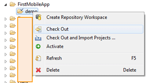 Once the package is created, right-click the package name (FirstMobileApp) and create a sub-package named demo. A sub-package is created only to organize the development artifacts. Now go to SAP HANA Repositories, FirstMobileApp > Demo (Figure 9), right-click demo, and from the context menu select Check Out.