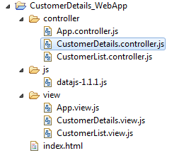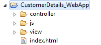 Next double-click the CustomerDetails_WebApp folder to open it (Figure 18) and create three new sub-folders. Sub-folders can be created by right-clicking the project name (in this case, CustomerDetails_WebApp) and clicking New and then Folder from the context menu options. These sub-folders contain the controller, .js, and view files, respectively. Once all the sub-folders are created, you see the folders as shown in Figure 18.