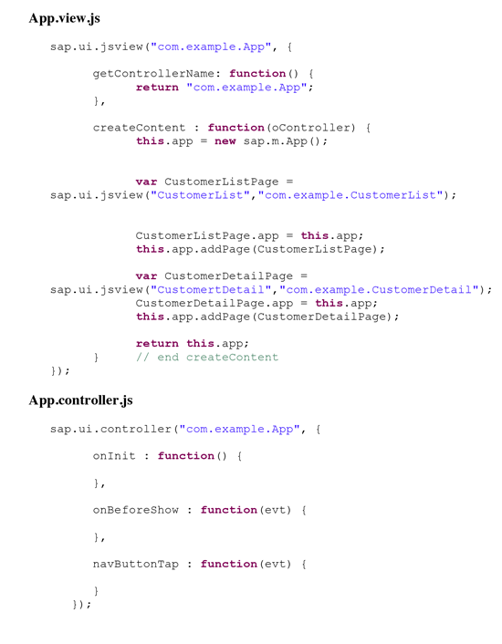 The next step is to create the App.view.js and App.controller.js files in the view and controller folders, respectively. These are the main controllers of the application. The App.view.js file contains the application object and it is set as one of the properties of the App view. The instances of all the views are created here and they are added to the App view as pages. The instance of the application object is retuned back from this view. The app view instance is placed at the root element in the document in the index.html file.