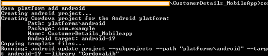 Use the Cordova utility to create a project. Below in Figure 26 is an example of how you can create the CustomerDetails_MobileApp project with this tool.