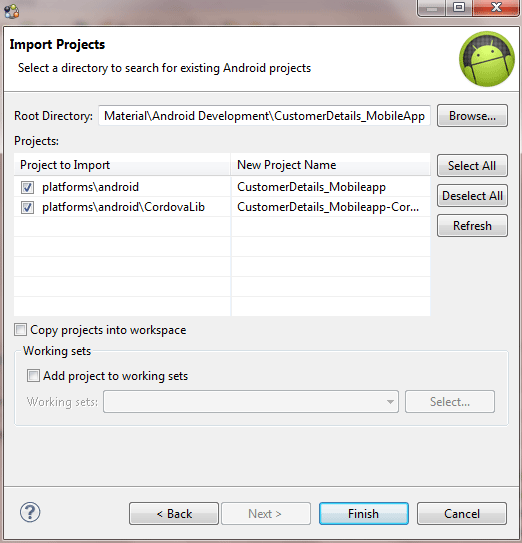 Select the CustomerDetails_MobileApp folder (the Root Directory) where the Android project was created by the Cordova Command Line Interface (CLI. Then select the files you want to import by checking the appropriate checkboxes. In this example, select the CustomerDetaials_Mobileapp and CustomerDetails_Mobileapp-CordovaLib files you created previously. Then click the Finish button. In the screen that appears (Figure 30), you see that two projects have been created, CustomerDetails_MobileApp and CustomerDetails_MobileApp–CordovaLib. The next step is to test them.
