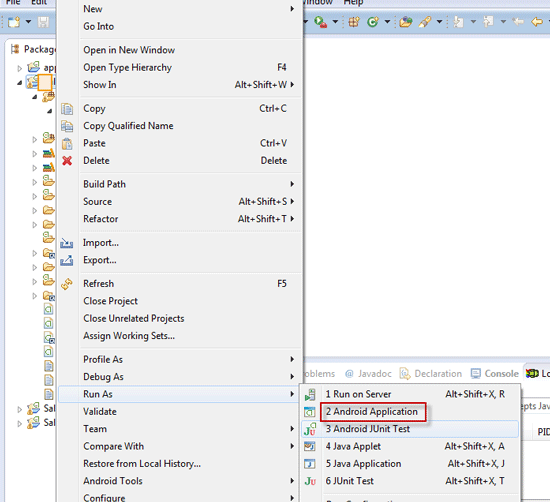 Now that all the setup is done, you are ready to deploy this mobile app on an emulator. Right-click the project name (Figure 37) and from the context menu select Run As and then Android Application.