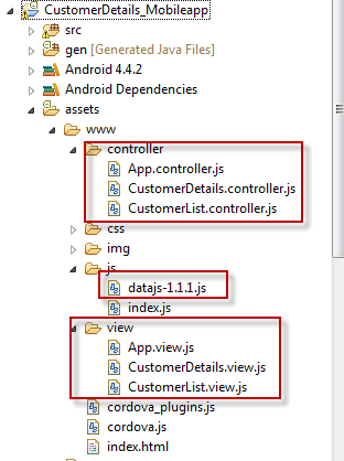 Put all the Web assets in the Assets folder of the Android application as shown in Figure 33. You can just copy paste the files in their respective folders. Files need to be copied in the Android project because when it is deployed as an Android application, these files need to be executed on the device.
