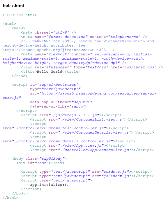 Modify the index.html file and replace it with the source code (shown in Figure 34; click here for a copy-and-paste version: Replacement index.html source code). Include all the view and controller files that are needed for this mobile application. The app.initialize() code is very important—it kicks off an event when the Cordova Web container is ready to render the HTML code and it is only at that point that you would like to make calls to the backend and display the pages. To respond to app.initialize() you need to modify the index.js file.