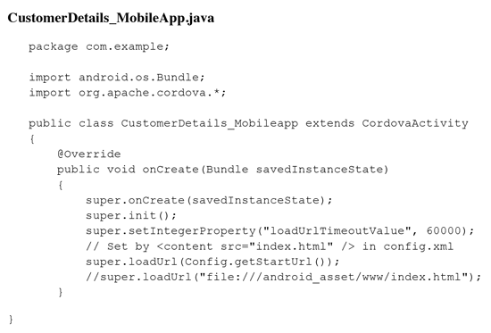 Next, go to the src folder and open the CustomerDetails_MobileApp.java file (Figure 36). Change the timeout value to 60 seconds (if you are making online queries to load JavaScript files from the server or make OData calls, then it could take longer than the 2 seconds). The default timeout setting is 2 seconds and increasing it to 60 seconds ensures that the application does not time out.