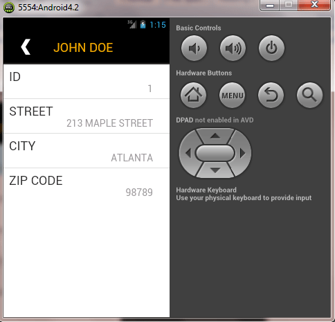 The Android Application opens in an emulator and you can see the customer list view on your mobile device (Figure 38). When you click CUSTOMER LIST at the top, you can navigate to the customer details view (Figure 39).