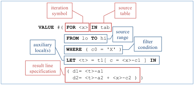 Is the set of values f (x) computed by result function f for all those elements x from the source set S for which predicate P(x) is true. When applied to the list container (popularized in many functional languages, e.g., Haskell), this is called list comprehension. In ABAP, the container concept is the internal table, so the name is adjusted in the obvious way. Syntactically, the result expression f (x) moves to the end. This way, table comprehension emerges as a smooth generalization of table construction with the VALUE operator (Figure 1).