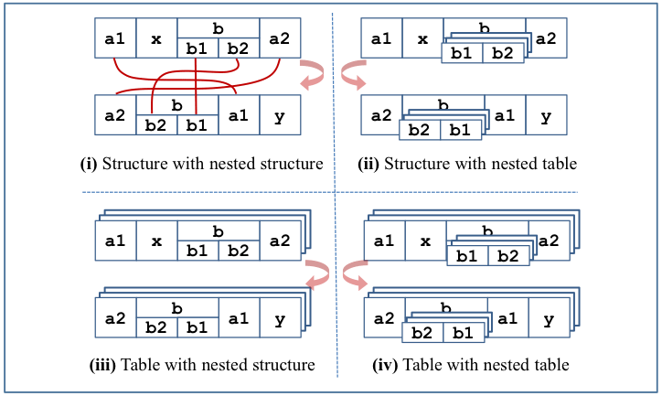 Consider the four cases in Figure 4. For simplicity, assume all leaf components have the same type (e.g., CHAR10). Previously, the “corresponding names” logic was limited to structures. Structure nesting was no problem; for example, in case (i) the sub-components of b were mapped correctly. But in case (ii), where b is a table component, it would be subjected to a structure-agnostic MOVE, resulting in swapped components b1 and b2 (or error, if they weren’t compatible.) Cases (iii) and (iv) were forbidden altogether.