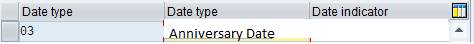 Enter 03 in the first Date type column and give a meaningful description in the second Date type column. Leave the Date indicator column blank. Click the save icon to save your changes and then the back icon to exit.