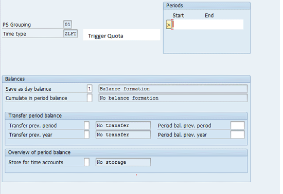 Enter the PS Grouping (as per your design—in this example, 01), Time type (ZLFT), give a meaningful description in the field to the right (Trigger Quota), and enter the Start and End periods.