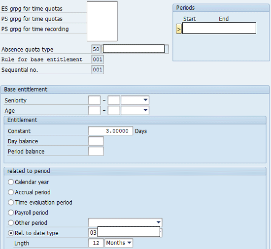 In the screen in Figure 5, enter the employee subgroup grouping, the personnel subarea grouping for time quotas and time recordings, the absence quota type, the rule for base entitlement, and the sequence number. In my example, the Constant value is 3.0000 Days. Select the Rel. to date type radio button and assign a value of 03 which was configured in step 1 (Figure 1). In the Lngth fields enter 12 and choose Months from the drop-down options, as the entitlement is created for 12 months.