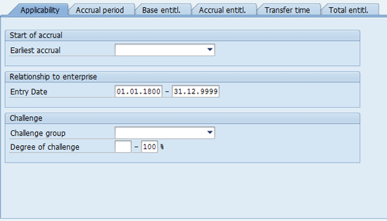 There are multiple tabs in table V_T559L: Applicability, Accrual period, Base entitl., Accrual entitl., Transfer time, and Total entitl, as shown in Figure 6. I discuss each in detail below.