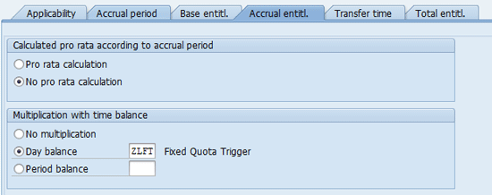 Accrual entitl. – Here (Figure 9) you configure the quota generation based on a pro rata or no pro rata calculation. Pro rata calculation is used for reducing the total number of quota generation in cases where an employee joins within a fixed quota validity period. In this example the No pro rata calculation radio button is selected because the validity period depends on the employee engagement date and it remains valid for the full period. Then select the Day balance radio button and assign ZLFT as the time type in Multiplication with time balance block, which was created in step 2 (Figure 3).
