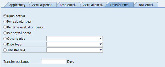 Transfer time – In Figure 10 you specify when to transfer the generated quota to infotype 2006. In my example, select the Upon accrual radio button because you want the Quota to be transferred to infotype 2006 as soon as it is generated.