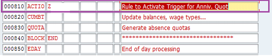 Some companies have a requirement for employees to provide absence quota entitlements on specific dates or on anniversaries. This can be the employee hiring date or any other date specification stored in infotype 0041.This type of entitlement is generated with the help of custom personnel calculation rules within time evaluation, if the design is for a positive time pattern. (A positive time pattern means time evaluation with clock times, which is based on the clocked-in or clocked-out time). I use a copy of SAP standard sample schema TM00, which is used to evaluate clocked-in and clocked-out times.