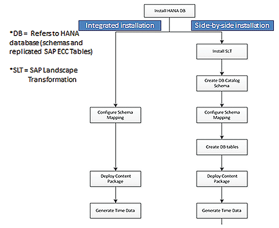 https://websmp201.sap-ag.de/~sapidb/011000358700000476572013E to find the details of what needs to be installed. The side-by-side (sidecar) solution involves an SAP ERP Central Component (SAP ECC) system running on a non- HANA database with a separate stand-alone HANA appliance, hosting replicated SAP ECC tables and the HANA Live views.