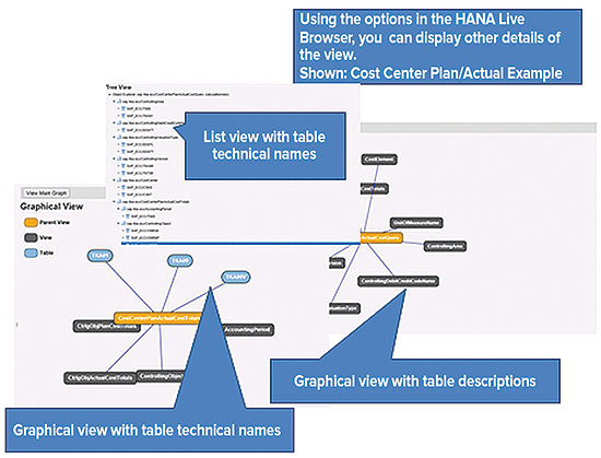 As mentioned previously, the next step would be to examine the underlying tables from which the view sources the data. In this case I show the plan/actual view of the HANA Live view (Figure 5). Please note that this figure is actually a compilation of three different HANA Live browser screens. One shows the underlying tables in list form; the other two are graphical views. With the graphical presentation there are two options: One shows the table labels, and the other shows the technical names of the tables in the view.