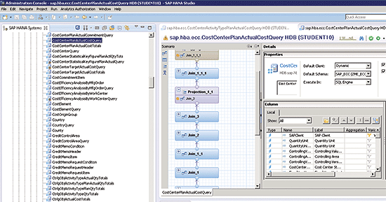 The last peek into the make-up of these HANA live views comes via the Modeler’s Perspective of the HANA Studio. As mentioned previously, the HANA Studio is the UI where modeling (view development or modification), application development (for Web-based applications using HANA XS as the Web application server), and database administration tasks are performed. Figure 6 shows the same HANA Live view (plan/actual), but this time in the HANA Studio’s Modeler Perspective. It is in this perspective that delivered objects are copied and modified.