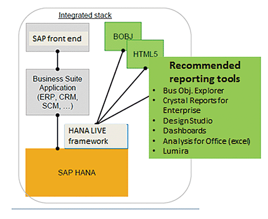 Companies running SAP ERP Central Component (SAP ECC) on SAP HANA can leverage virtual data models that are easy to deploy, extend, and consume for BusinessObjects-based operational reporting without SAP NetWeaver Business Warehouse (SAP NetWeaver BW). Leveraging SAP HANA Live enables fast, flexible FI operational reporting with SAP ECC running on SAP HANA.