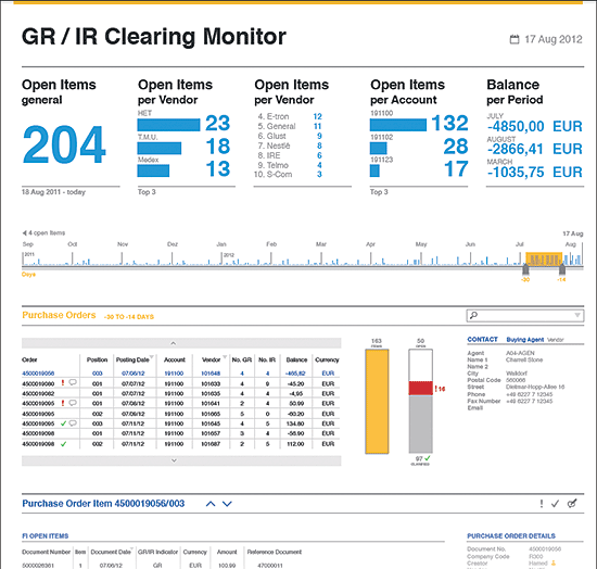 Figure 8 shows the SAP Goods and Invoice Receipt Reconciliation GR/IR clearing monitor screen. This Web-based application technically is executed using the HANA server’s built-in Web server, the XS engine, on top of a delivered HANA Live view. A little more SAP-provided code is needed to use this application, but it is simple to install.