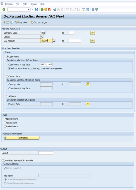 Step 2. Display G/L Account Line Item Browser (G/L View) Download Functionality