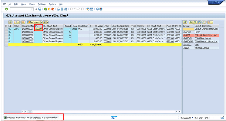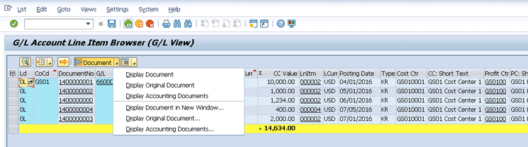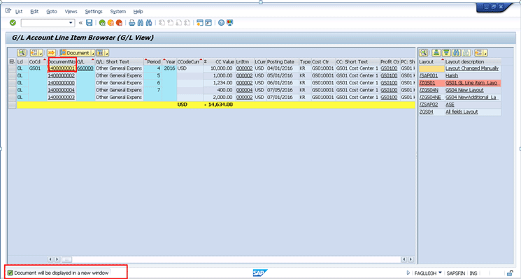 This helps you keep the original report in the same session that you are working on and also view the document in another screen. This is the new functionality in these line item browsers that brings the document in a new session. Sometimes users want to see all the line items posted for a particular document so that they can see the overview of the accounting document. In the current line item report, you have to double-click the line item to view the document, but your original report displays the document. To return to the line item report, you need to click the back button twice.