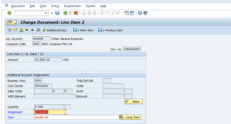 After you see the message in Figure 12, the system immediately opens another session and displays the line item 2 of the document as shown in Figure 13.