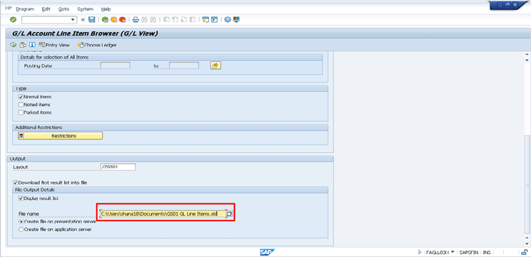 After you enter data in the Company Code and G/L Account fields in the General Restrictions section, go to the Output section and enter the name of your layout in the Layout field (e.g., /ZGS01). Select the Download first result list into file check box and the Display result list check box. In the File name section select the Create file on presentation server radio button as shown in Figure 15. After you enter this data, click the input icon in the File name section to provide the path for the file name. Enter the path as shown in Figure 16 and then click the execute icon.