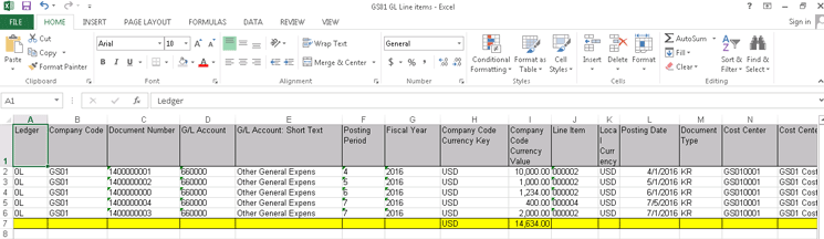 The G/L line item Excel file display