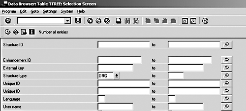 Go to the Data Browser via transaction code SE16. Type in TTREE and press Enter to arrive at the screen shown in Figure 1. Query the table for all entries of type IMG and click on Execute. Make sure that all available entries are pulled up by specifying a maximum number of hits of 3,000.