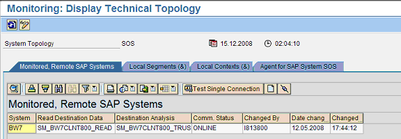 Step 5. Verify all RFC connections are online. You need to make sure that the RFC connections are online for satellite systems in SAP Solution Manager CEN. Run transaction RZ21. Select the Agents for Remote SAP Systems tab and click on the display overview. Click the Monitored, Remote SAP Systems tab and ensure that all RFC connections are online (Figure 12).