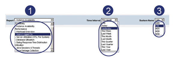 After accessing IT Performance Reporting using one of the options above, you have the following selection options: First (Report), you need to select which report you want to see; second (Time Interval), you select the time interval of the data you want to see on that report; and third (System Name), you select the SAP instances you want on the report. For the system name, you have the option to select all systems (All) or pick one SAP instance (e.g., M25) (Figure 4).