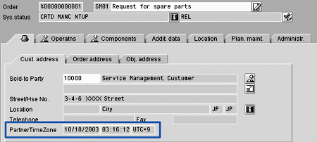 The configuration for time zone selection based on geographic location (transaction STZGC) is used to automatically populate the time zone in the customer master, vendor master, and other business objects that use central address management. (See Figure 13.) The customer or vendor time zone is used in many modules to determine the time of service delivery. In the Service Management module, the customer’s local time is displayed in a service order so that the user knows when a customer can be contacted. (See Figure 14.)