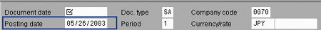 2. FI Documents (Default Document Date): For FI document entry (transaction FB01), the posting date is always a default based on the user’s local date (Figures 4 and 5). Say at the end of the day for a U.S. East Coast company that the posting date is 05/25/2003. The company’s Japanese counterparts, who are just arriving at work, would have a posting date of 05/26/2003 at that time. During most of the fiscal period, this is not an issue. However, at close, the difference can become a problem. During the close periods, all users should be careful of the posting date they use to ensure transactions are posted in the correct fiscal period.