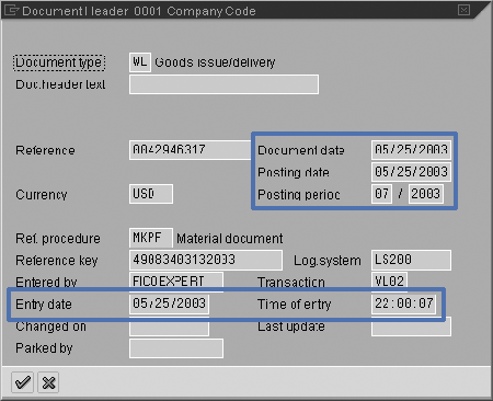 3. FI Documents (Entry Date): The entry date in the FI and CO document header is always in system time (Figures 6 and 7), regardless of the user’s personal time zone. This enables a consistent timestamp to be placed on all transactions so the correct order of transactions is recorded regardless of where in the world they originated. In the case of Figures 6 and 7, you can see that logistics transactions MB11 and VL02 take account of the Personal time zone setting, as well as FB01.
