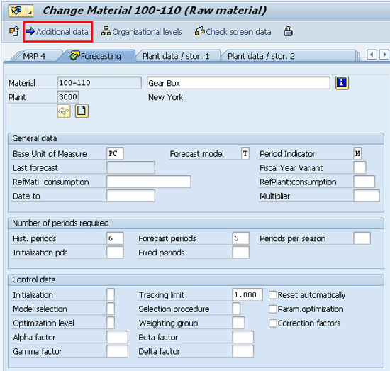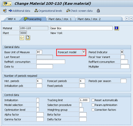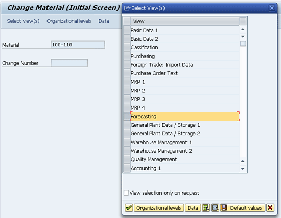 You can enter the forecast parameters in the forecasting view of material master using transaction MM02. Figure 1 is the material master change screen. Select the Forecasting view for material 100-110 and press Enter. The system brings up Figure 2, which is the organizational data view of the material master.