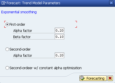 Figure 12 shows that, since I am using Trend models, the system prompts me to make use of Alpha and Beta factors for smoothing. You can either use the smoothing factors that the system proposes or you can overwrite them with your own desired values. Click the Forecasting button in Figure 12 and the system brings up the forecast results, as shown in Figure 13.